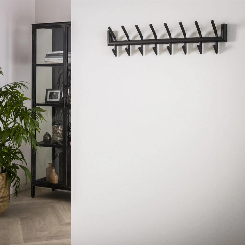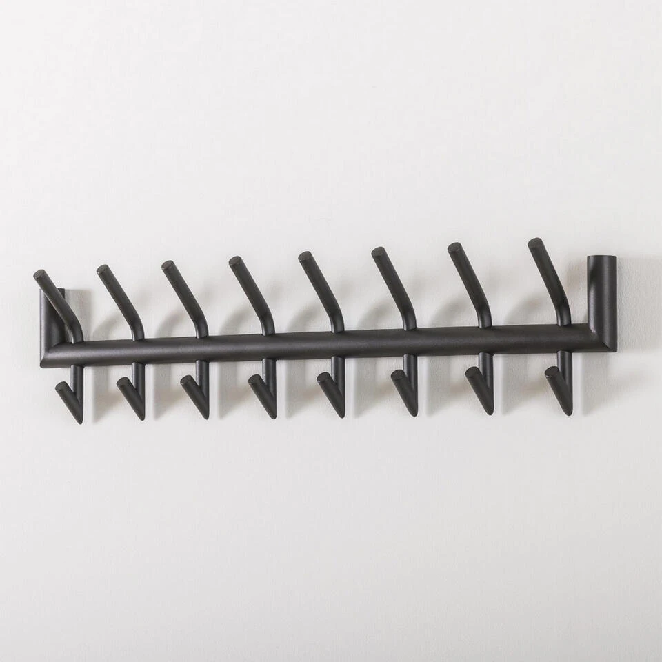 Kapstok Bello is erg populair dankzij zijn neutrale design met een stoere touch. Deze wandkapstok heeft een breedte van 78 cm en komt uit de collectie van het woonmerk Fraaai. Hij is voorzien van acht handige haken, welke elk twee ophangmogelijkheden hebben. Dit exemplaar is in zijn geheel uitgevoerd in stevig staal en heeft als afwerking een matte donkergrijze poedercoating gekregen. Dankzij de twee bevestigingspunten aan de achterzijde, kan deze kapstok gemakkelijk aan de wand gemonteerd worden. Bevestig kapstok Bello aan een wand in de hal, woonkeuken of slaapkamer en geniet van een opgeruimd interieur. Tevens verkrijgbaar in een variant met zes haken.